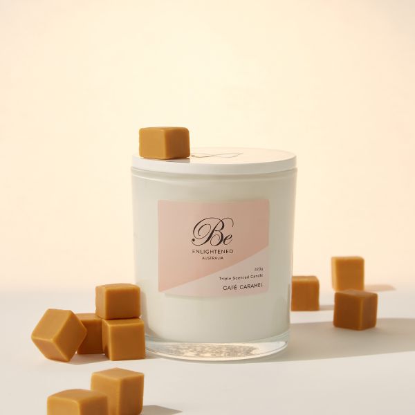 The Cafe Caramel Be Enlightened Triple Scented Candle has warm blend of Maple French Vanilla, Anise, Malt and coffee latte. A guilt free delight.