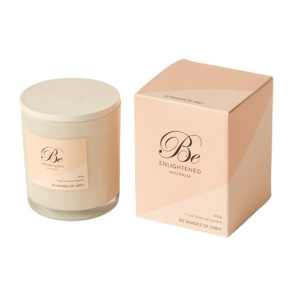 Each 50 Shades of Grey Elegant candle is a highly fragranced, double wick candle that lasts up to 80 hours. Each candle is hand-poured and made in Australia, with high quality non-toxic soy wax blend and lead free cotton wicks. The candle has a diameter of 10cm and a height of 12cm with an embossed silver coloured lid which is used to snuff out the flame.